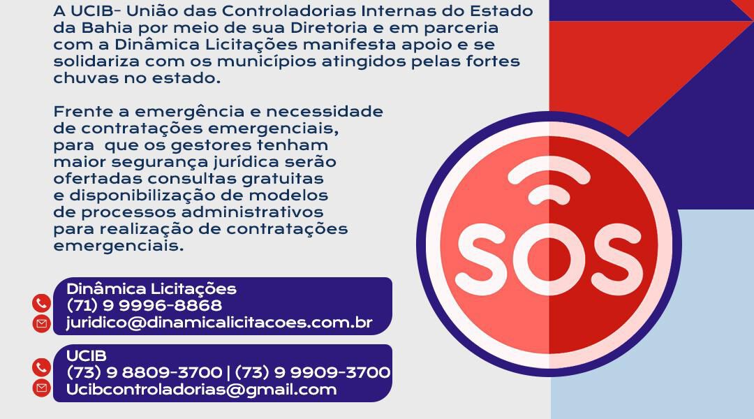 Solidariedade e Cooperação A UCIB- União das Controladorias Internas do Estado da Bahia por meio de sua Diretoria e em parceria com a Dinâmica Licitações manifesta apoio e se solidariza com os municípios atingidos pelas fortes chuvas no estado. Frente a emergência e necessidade de contratações emergenciais, para que os gestores tenham maior segurança jurídica […]