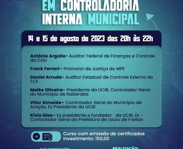 UCIB – CURSO ON-LINE DE BOAS PRÁTICAS EM CONTROLADORIA INTERNA MUNICIPAL Datas: 14 e 15 de agosto de 2023 das 20h às 22h O curso será realizado de modo on…
